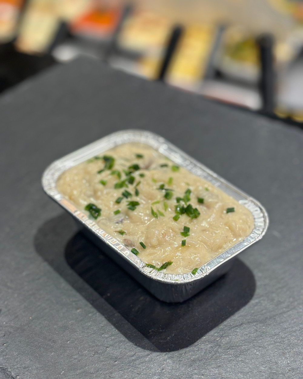 Riz blanc crémeux, emmental, vin blanc, grana padano, champignons de Paris et oignons frits.